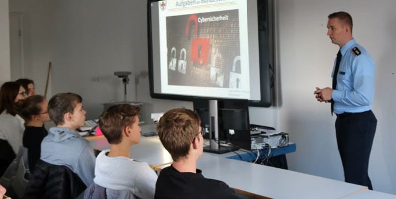 Am Montag, den 22 7.2019, besuchte der Jugendoffizier der Bundeswehr, Hauptmann Gram, die Klasse M3IM1.