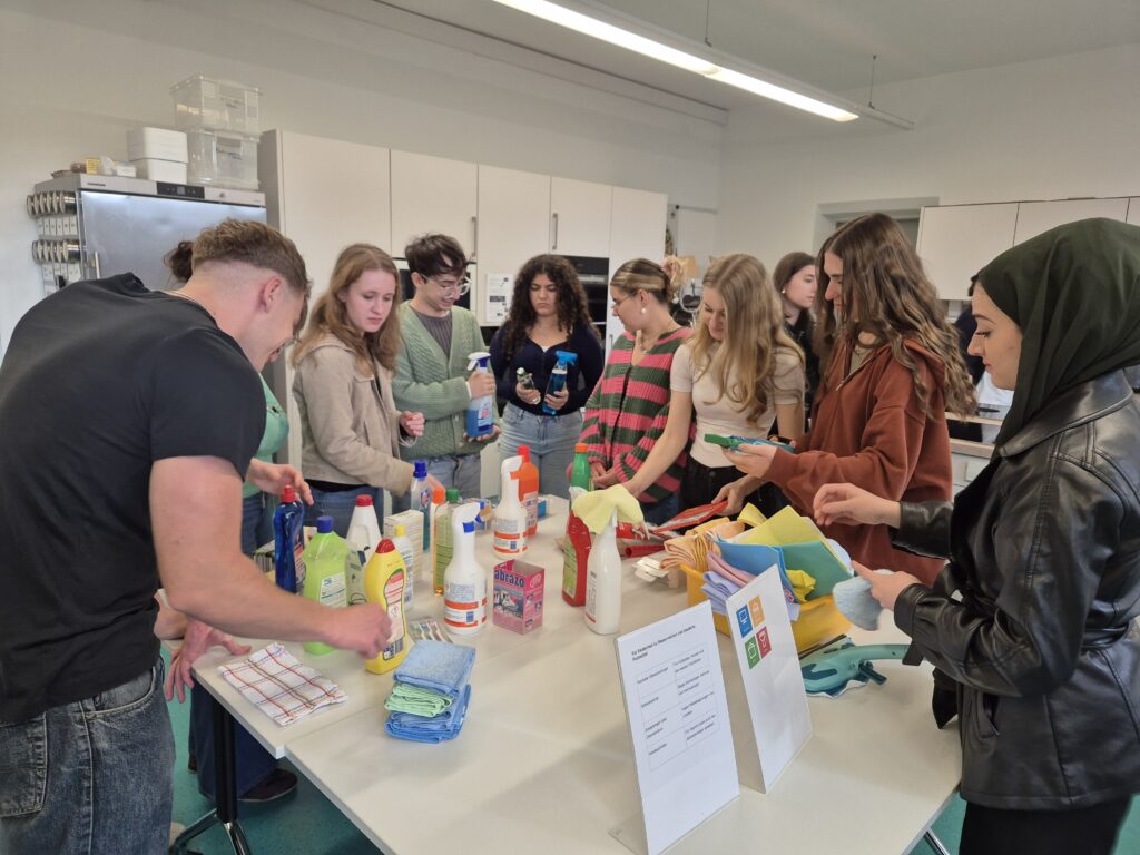 Schon zu Beginn wurde uns klar: Lebensmittel kosten nicht nur Geld, sondern erfordern auch kluge Planung. Gemeinsam überlegten wir, wie ein Wochenplan z. B. im Studium aussehen könnte, was man wirklich braucht – und was oft unnötig im Einkaufswagen landet. Wir diskutierten über die Ausgaben für Lebensmittel und wie man sich mit einem kleinen Budget trotzdem ausgewogen ernähren kann. Dabei wurden wir aktiv und erstellten eigene Einkaufslisten. Weiter ging es mit dem Thema Ordnung und Reinigung. Hier hieß es: Ärmel hochkrempeln und loslegen! Mit verschiedenen Putzmitteln und weiteren Utensilien, die beim Aufräumen helfen, durften wir selbst testen, wie man Oberflächen richtig reinigt, welches Produkt wofür verwendet wird – und was man besser vermeiden sollte. Praktischer geht’s nicht! Dabei wurde auch deutlich, wie wichtig Sauberkeit und Hygiene im Haushalt sind, aber auch, wie viel man mit umweltbewussten Mitteln erreichen kann.