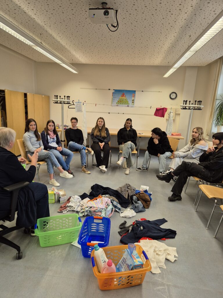 Auch die Wäschepflege kam nicht zu kurz – im wahrsten Sinne des Wortes. Wir sortierten Wäsche in verschiedene Körbe, lernten, welches Waschmittel wofür geeignet ist und worauf man bei Pflegeetiketten achten sollte. Und dann wurde genäht: Jede*r von uns durfte an einem Stück Stoff einen Knopf annähen.